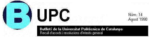 PERSONALPersonal acadèmicS'aprova la convocatòria de places de catedràtic d'universitat, tal com figura al document CS 2/7 1998Acord del Consell Social. Núm. 15/98 Data: 14 de juliol de 1998 ![]() Sol·licitud de canvi de departament Acord de la Junta de Govern. Núm. 58/1998 Vicerectorat de Personal Acadèmic Data: 23 de juliol de 1998 ![]() ![]() Normativa per a la provisió i contractació temporal de professorat Acord de la Junta de Govern. Núm. 65/1998 Vicerectorat de Personal Acadèmic Data: 23 de juliol de 1998 ![]() ![]() Canvis retributius del professorat Acord de la Junta de Govern. Núm. 74/1998 Vicerectorat de Personal Acadèmic Data: 23 de juliol de 1998 ![]() ![]() Resolució de 8 de juliol de 1998, per la qual es fa pública la composició de les comissions que han de resoldre els concursos per a la provisió de diverses places docents, convocats per Resolució de 13 de març de 1998 Font: DOGC núm. 2692 de 30 de juliol de 1998, pàg. 9727 Resultats de concursos de professors Ramon Bragós Bardia,