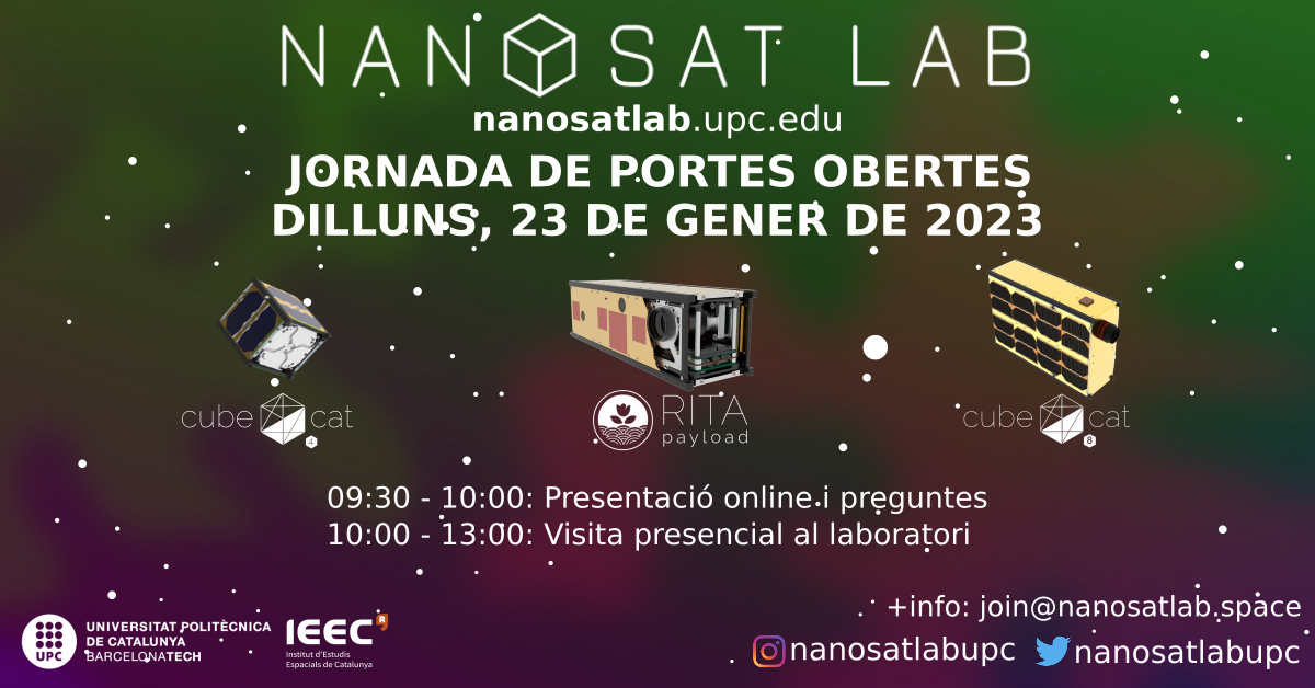 Dissenyar i desenvolupar instruments d'observació terrestre, així com comunicacions de satèl·lits i missions de petits satèl·lits, en col·laboració amb l'Agencia Espacial Europea (ESA) i altres organismes són algunes de les activitats acadèmiques i de recerca que es duen a terme al NanoSat Lab de la Universitat Politècnica de Catalunya - BarcelonaTech (UPC) i que es donaran a conèixer dilluns, 23 de gener en la presentació en línia que tindrà lloc a les 9:30 h i en la qual s'explicaran també els actuals projectes del laboratori. De 10:30 a 13 h, el NanoSat Lab, ubicat al Campus Diagonal Nord de la UPC, obrirà les portes per mostrar part d'aquests projectes i les instal·lacions de Barcelona.