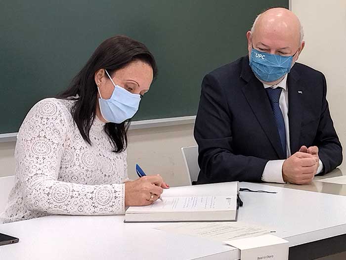 Beatriz Otero signant de nou com a directora del Departament d'Arquitectura de Computadors de la UPC, amb el rector Daneil Crespo al costat