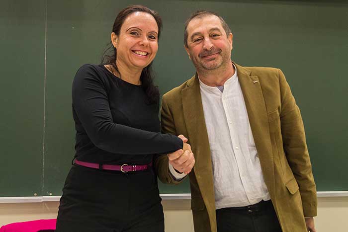 Beatriz Otero, a l'esquerra, donant la mà al rector, Francesc Torres, durant l'acte de presa de possessió
