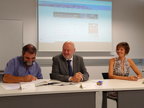 D'esquerra a dreta: el professor Jordi Puiggalí, el rector Daniel Crespo i la secretària general Ana B. Cortinas, durant la presa de possessió