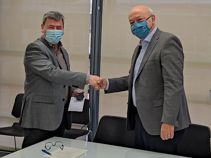 Jordi Salazar, a l'esquerra, donant la ma al rector Daniel Crespo durant l'acte de presa de possessió