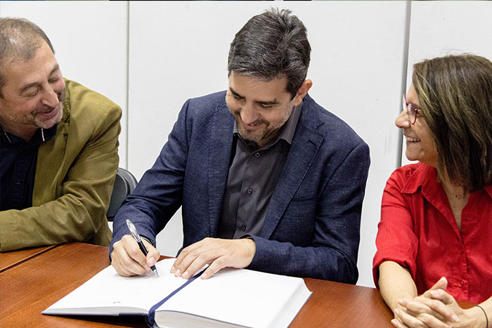 El professor i investigador Lluís Giménez, en el moment de prendre possessió del càrrec com a director del Departament de Representació Arquitectònica. Al seu costat, el rector Francesc Torres i la Secretària General, Marta de Blas