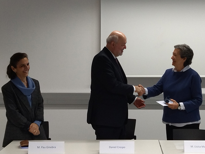 El rector de la UPC, Daniel Crespo, dona la mà a Maria Lluïsa Maspoch en l’acte de presa de possessió del càrrec, que ha comptat amb la participació de la professora Maria Pau Ginebra, al capdavant del Departament des del 2016.