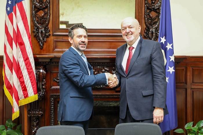 El conseller de Diplomàcia Pública de l'ambaixada dels Estats Units i copresident de la Comissió Fulbright, Jon Piechowski, amb el rector Daniel Crespo, en l'acte de signatura del conveni
