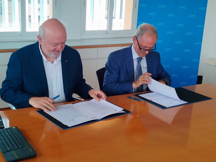 El rector Daniel Crespo, de la UPC, i César Molins, director general d'AMES, signant l'acord de renovació de la Càtedra