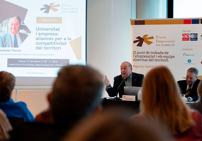 El rector Francesc Torres, que en la seva intervenció en el Fòrum Empresarial del Llobregat ha presentat l’aposta de la UPC per la formació transversal, la innovació, la recerca, la transferència de tecnologia i la connexió amb la indústria, així com l’emprenedoria, ha afirmat “al Baix Llobregat hi ha molta indústria competitiva i per continuar essent-ho cal que incorporin innovació i professionalitat. Creiem que aquesta col·laboració pot ser molt bona perquè, a més, ens permet conèixer molt millor les necessitats del teixit productiu proper”.