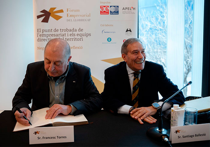 El rector de la UPC, Francesc Torres, i Santiago Ballesté, president de AEBALL, durant el Fòrum Empresarial del Llobregat
