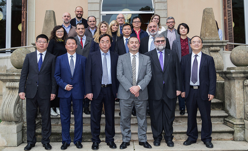 L'alcalde de Shaoxing i representants de la Shaoxing University amb el rector de la UPC, Francesc Torres, el vicerector de Transferència de Coneixement i Innovació, Jordi Berenguer, i altres representants institucionals
