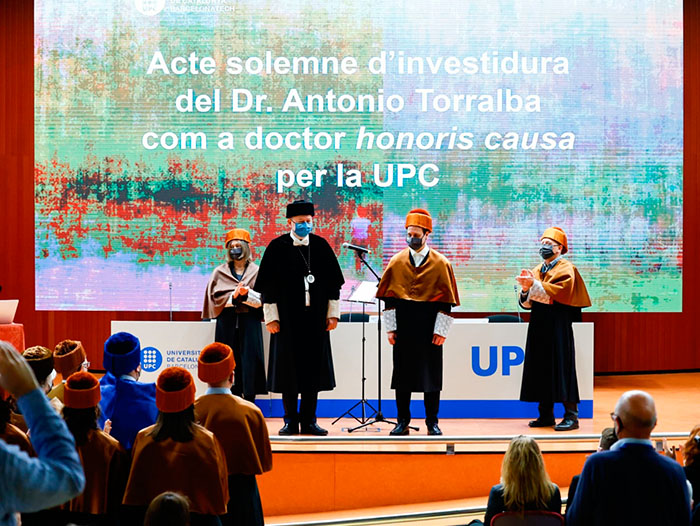 Torralba ha rebut de mans del rector, Daniel Crespo, el diploma, el birret, l'anell i els guants blancs, com a símbols del doctorat. En la seva intervenció, el rector ha afirmat que Antonio Torralba és la constatació de com la passió és el principal motor d’una carrera acadèmica excepcional i ha afegit que “ens inspira la seva constant dialèctica entre l’especialització i la transversalitat”. Antonio Torralba, ha destacat el rector, “ha estat sempre un científic amb una visió interdisciplinar, que li ha permès mirades i aproximacions innovadores”.