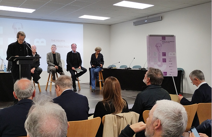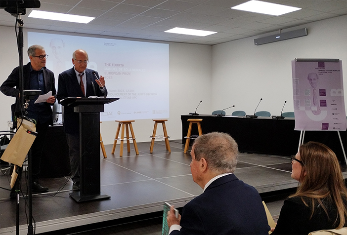 Els professors Carles Crosas i Josep Parcerisa, amb l'arquitecte Joan Busquets assegut a primera fila, en l'apertura de l'acte de lliurament