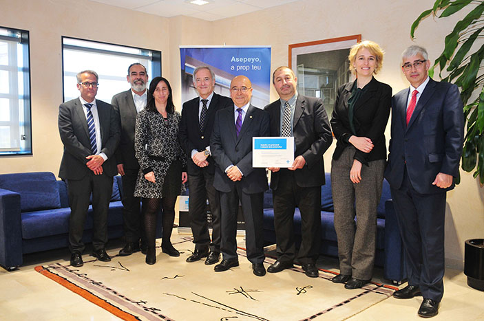 El rector de la Universitat Politècnica de Catalunya · Barcelona Tech (UPC), Francesc Torres, ha rebut de mans del director gerent d’Asepeyo, Vicente Aparicio, el certificat que acredita la bona gestió de la Universitat en matèria de prevenció de riscos laborals. L’acte de lliurament ha tingut lloc el 20 de març al Centre d’Innovació i Investigació en Prevenció de Riscos Laborals d’Asepeyo a Sant Cugat del Vallès.