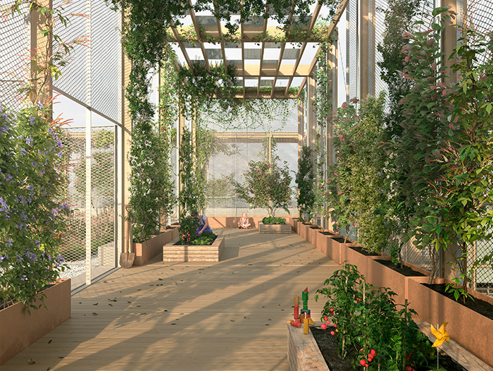 Imatge de l'espai comunitari previst a la coberta de l'ampliació. Imatge: Render de Recuerdo Studio