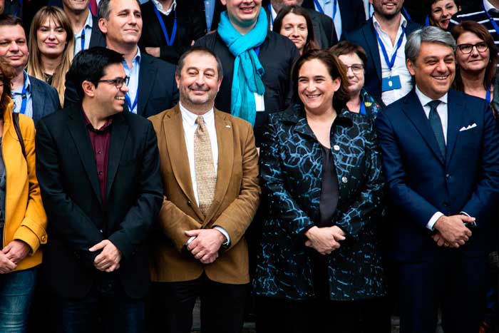 El rector de la UPC, Francesc Torres (al mig de la imatge), juntament amb l'alcaldessa de Barcelona, Ada Colau, el primer tinent d'alcaldia, Gerardo Pisarello, i el president de SEAT, Luca de Meo, a la primera assemblea general de l'EIT Urban Mobility a Barcelona