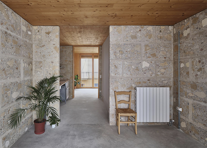 Interior de l'edifici del projecte 'Viviendas sociales 2104' a Mallorca, que aprofita el material de l’enderroc d'una antiga escola. Imatge: Harquitectes
