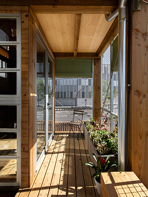 Fotografia frontal del prototip construït al Campus Diagonal Besòs, guanyador del repte urbà a la regeneració d’edificis d’habitatges amb sistemes innovadors sostenibles. Imatge: José Navarrete, Coleccionistas de momentos