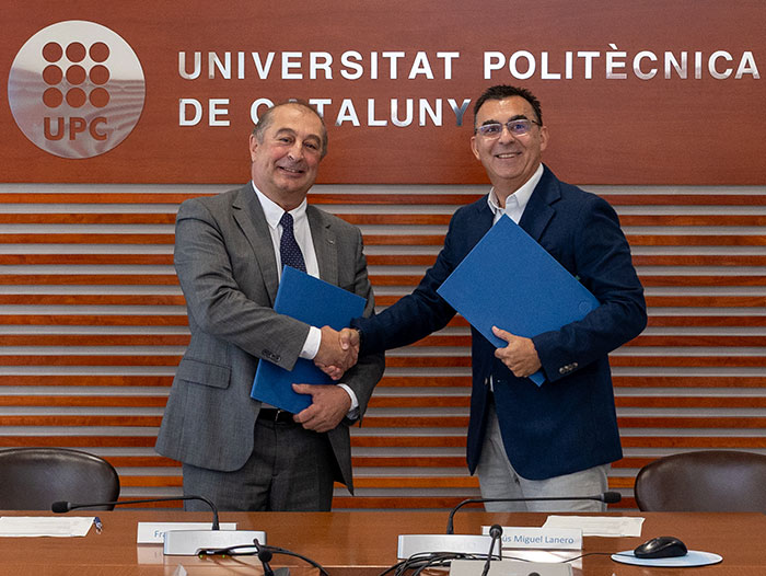 Francesc Torres, rector de la UPC (a l'esquerra), i Jesús Lanero Mencía, director general de CaixaBank Tech (a la dreta), durant la signatura de l'acord de col·laboració, al rectorat de la Universitat.