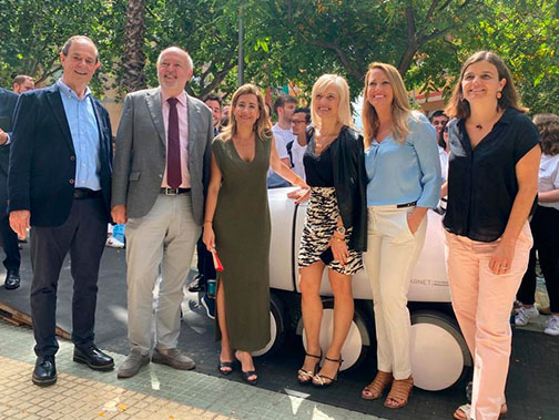 D'esquerra a dreta, Lluís Jofre, director de CARNET; el rector Daniel Crespo; la ministra de Transports, Mobilitat i Agenda Urbana, Raquel Sánchez; la delegada del Govern a Catalunya, Maria Eugènia Gay; l’alcaldessa d’Esplugues, Pilar Díaz; i la responsable executiva i científica de CARNET, Laia Pagès, en l'acte de presentació del robot Ona a Esplugues de Llobregat