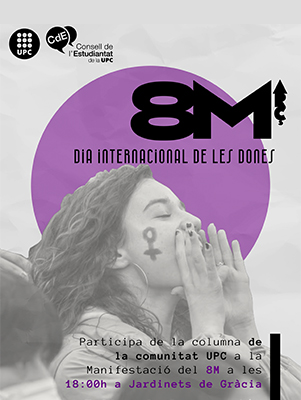 La manifestació del 8M, Dia Internacional de la Dona, a Barcelona sortirà a les 18 h de Jardinets de Gràcia, a Barcelona. Des d'aquest punt, sortirà la columna de la comunitat UPC que encapçala el Consell de l'Estudiantat. La comissió d'Igualtat de la UPC s'ha adherit a aquesta crida a la comunitat universitària.