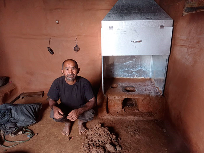 Un habitant d'una zona rural del Nepal al costat d'una cuina-xemeneia, la qual li permetrà viure sense fum