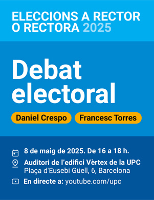 Els candidats a rector de la UPC, Daniel Crespo i Francesc Torres, han debatut les seves propostes el 8 de maig. El debat, que ha tingut lloc a l’Auditori de l’edifici Vèrtex de la UPC, al Campus Diagonal Nord de Barcelona, també s'ha pogut seguir en directe per YouTube.