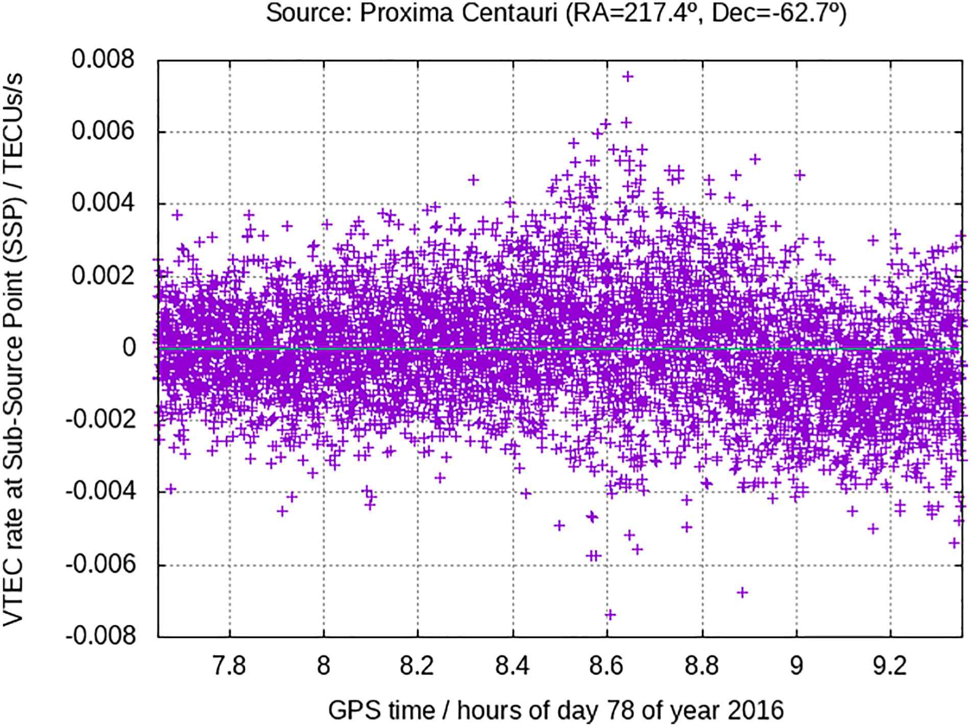 Empremta en el ritme de variació del nivell d'ionització de la part alta de l'atmosfera (ionosfera) a la vertical de la estrella Proxima Centauri, probablement deguda a una gran fulguració que va mostrar el 18 de març de 2016 (mesurat amb dades GPS en dues freqüències)