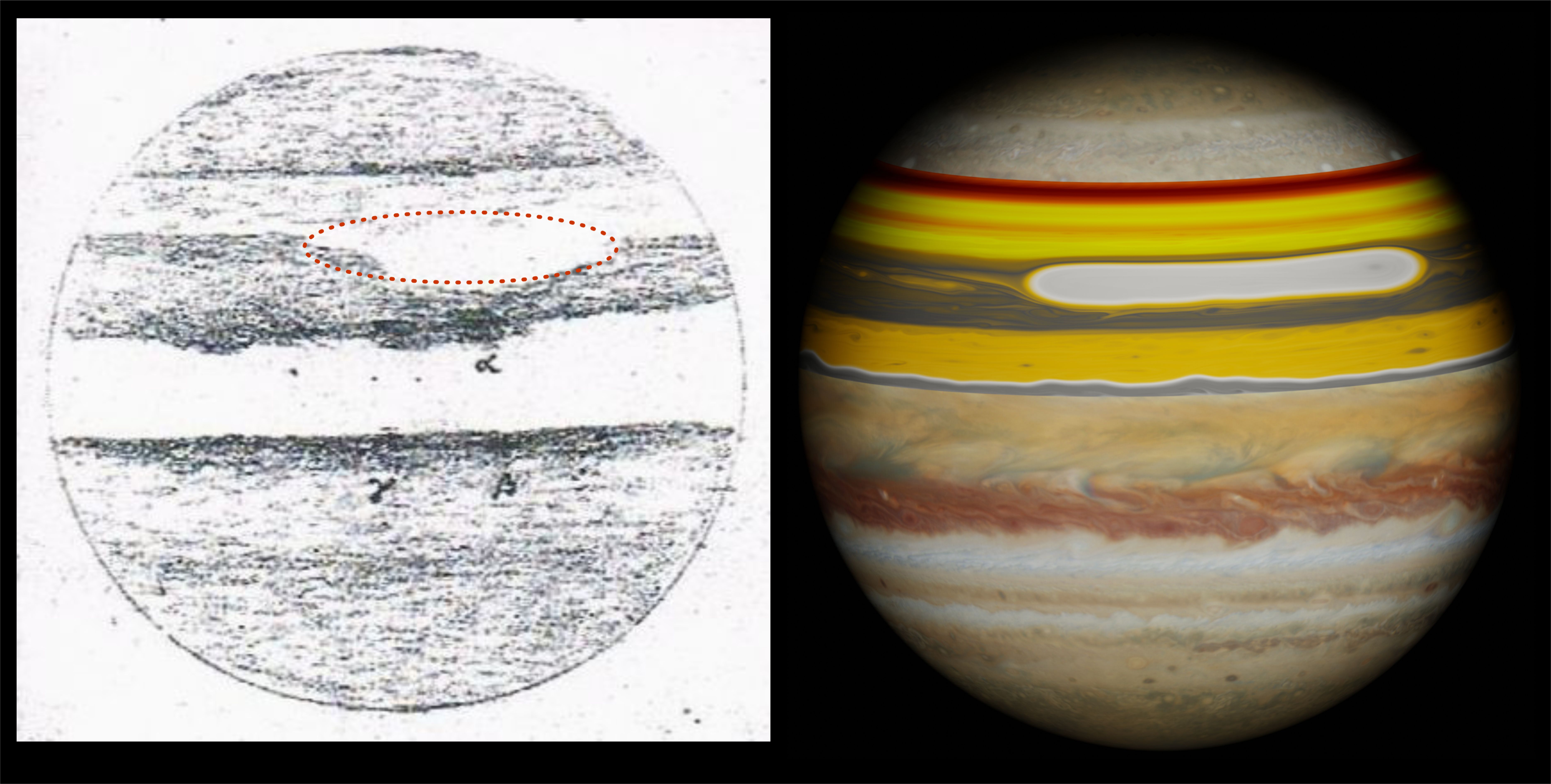 Observació i simulació de la gènesi de la GRS. A l’esquerra, dibuix de Júpiter realitzat per S. Swabe el 10 de maig de 1851, que mostra l'àrea de la GRS com un gran oval clar amb les vores marcades per una línia vermella a traços. A la dreta, model de simulació numèrica d'una llarga cèl·lula lentament rotant engendrada pels vents de Júpiter superposada sobre una imatge recent del planeta obtinguda amb el Telescopi Espacial Hubble (HST/NASA/ESA). Les imatges estan orientades en visió astronòmica (sud a dalt, est a l'esquerra). Crèdits: ©UPV-EHU/UPC.
