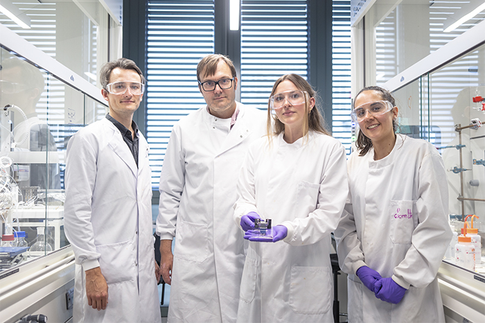 D'esquerra a dreta, els investigadors Paulius Baronas, Kasper Moth-Poulsen, Helen Hölzel i Lorette Fernandez, al laboratori MOST de la UPC. Imatge: Paulius Baronas