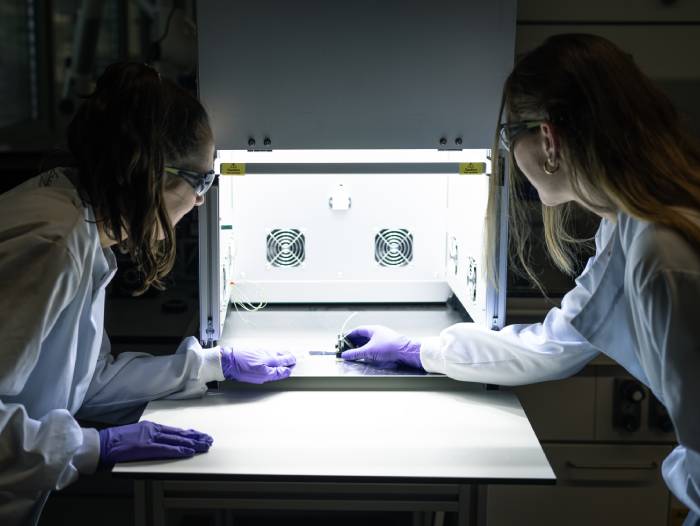 Les investigadores Lorette Fernandez i Helen Hölzel, provant el dispositiu Hybrid MOST-PV
