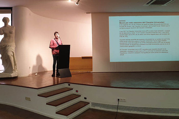 L'estudiant Alejandro Adán va presentar al Claustre la moció en què es demana la realització de més sessions d'aquest òrgan