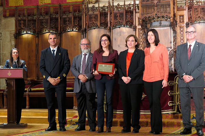 La investigadora Ana María Lacasta, responsable del Laboratori, amb la placa commemorativa, al costat de l'alcaldessa de Barcelona, Ada Colau