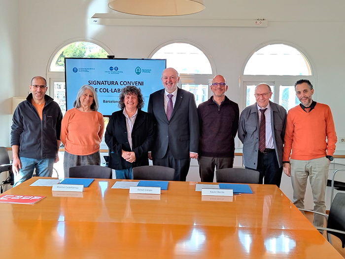 Acte de signatura del conveni. D'esquerra a dreta: Iván Cáceres, investigador del LIM; Marisa Méndez-Vigo, regidora de Medi Ambient; l'alcaldessa, Montse Castellarnau; el rector Daniel Crespo; Xavier Borràs, secretari accidental de l'Ajuntament; Agustín Sánchez-Arcilla i Daniel González-Marco, investigadors del LIM