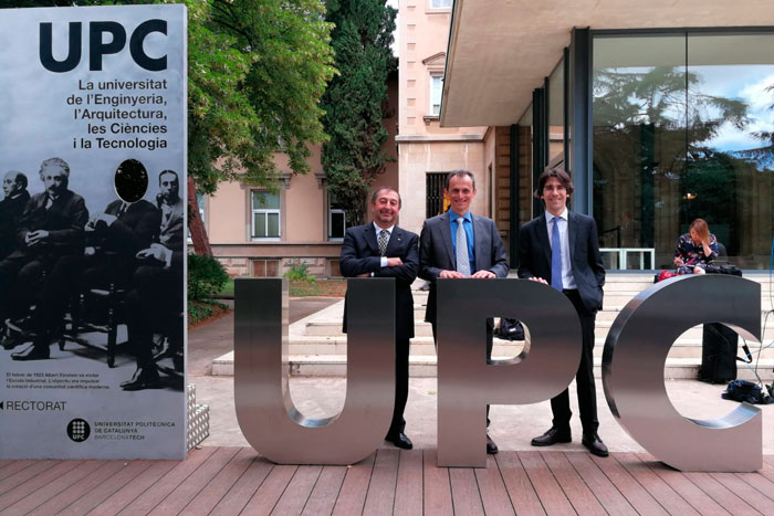 El rector Francesc Torres; el ministre Pedro Duque i el director associat del BSC - CNS, Josep Maria Martorell, als jardins de Torre Girona
