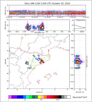 El grup de recerca Lightning Research Group (LRG) de la UPC al Campus de Terrassa va enregistrar l’activitat elèctrica atmosfèrica durant els dies 29 i 30 d’octubre a València i Catalunya a través de la xarxa de detectors Lightning Mapping Array (LMA). Va haver-hi pics, entre les 13 i les 15 hores, de 1.000 emissions elèctriques per km².