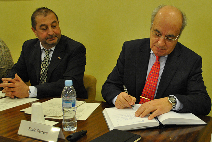 A la dreta, Enric Carrera, en el moment de la signatura, amb el rector Francesc Torres, a l'esquerra