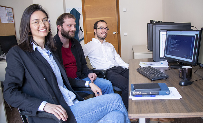 Membres del Barcelona Quantum Monte Carlo group, que desenvolupa el projecte SOQUGAL. D'esquerra a dreta: Grecia Guijarro, Iacopo Torre i Juan Sánchez