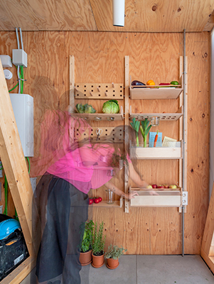 L’interior de l’espai està dissenyat amb peces mòbils i un mobiliari que es pot distribuir segons les necessitats dels habitants: la cuina, i fins i tot la banyera, disposen de rodes que permeten transportar-les allà on vulguin ser utilitzades. A més, disposa de plaques solars, però no d'acumuladors, de manera que s’hauran d'aprofitar les hores de sol per dur a terme totes aquelles activitats que requereixin electricitat.