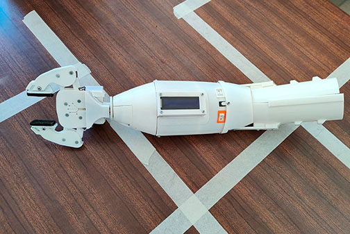 Després de la creació d’una primera pròtesi l’any passat, l’equip ha fet un pas endavant amb la creació d’un segon prototip, un braç robòtic totalment funcional, que permet fer els moviments de pronosupinació (rotació del canell) i obertura-tancament de la mà. Aquests moviments són possibles gràcies a uns sensors EMG que s’encarreguen de recollir les ordres que el pacient envia al dispositiu mitjançant la contracció de fibres musculars determinades i de transformar aquests impulsos elèctrics en un senyal que el microcontrolador pugui entendre i utilitzar.
