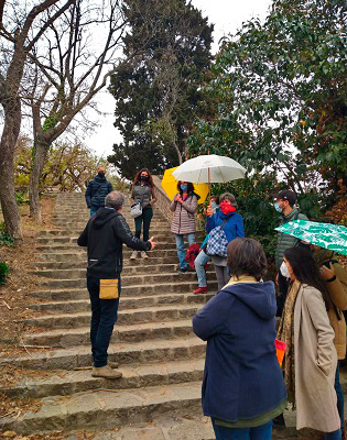 La pluja no va aturar els participants per seguir el recorregut per les terrasses de Miramar, també a Montjuïc, proposat i comentat per Xavier Fàbregas