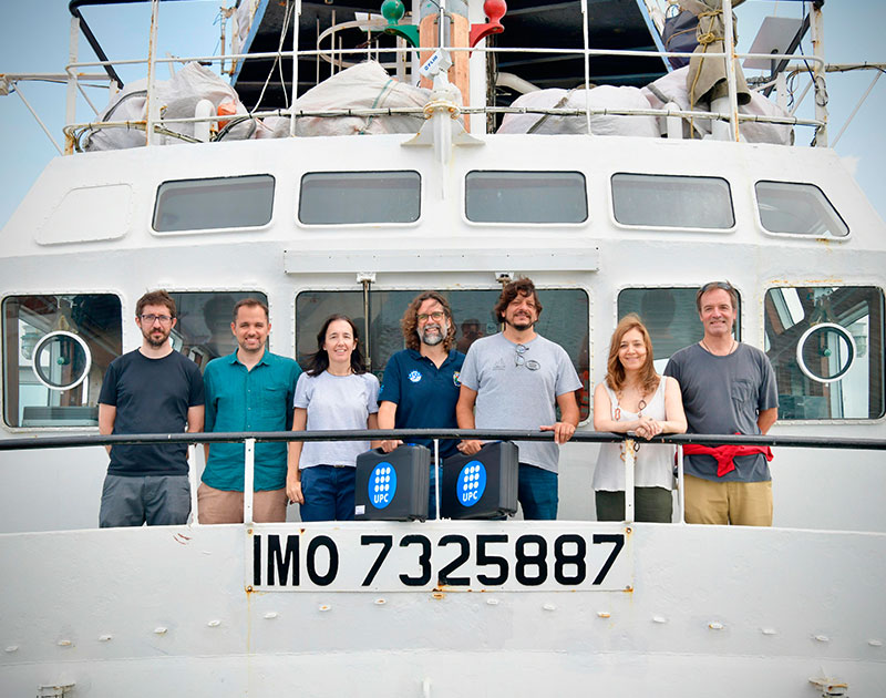 D'esquerra a dreta: Pau Trubat, professor de l'FNB; Alex Ferrer, professor de l'ESEIAAT; Carmen Borja, de Fractus; Xavier Martínez, professor de l'FNB; Martín Maretta, d'Open Arms; Clàudia Barahona, professora de l'FNB, i Rubén Bonet, de Fractus.