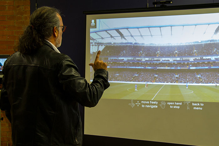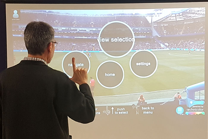 L'investigador de la UPC Josep Ramon Casas demostra com interactuar per veure un partit de futbol com si s'estigués en el camp