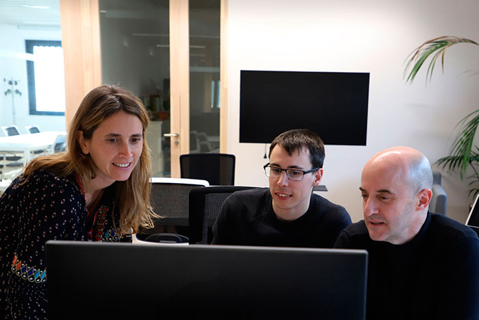 Clara Prats, del grup BIOCOM-SC de la UPC, juntament amb Martí Català i Pere Joan Cardona, els dos de l’IGTP, són part de l'equip investigador que treballa en el model matemàtic
