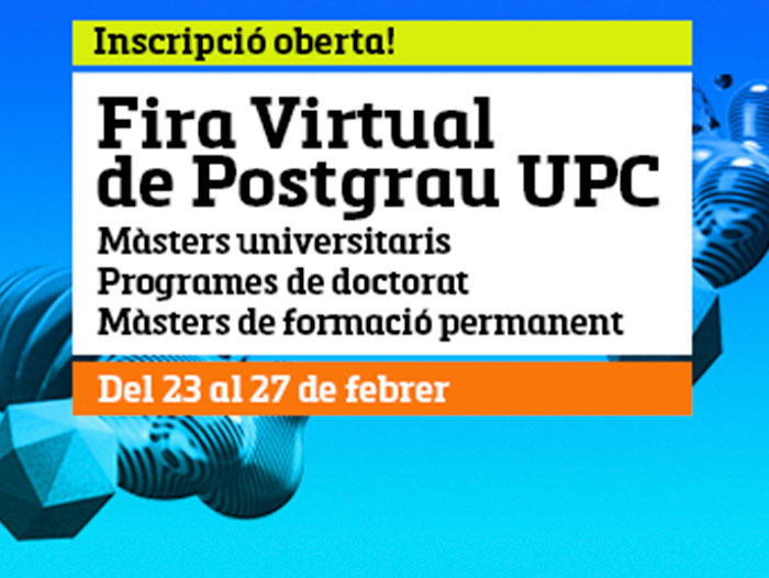 La 4a Fira Virtual de Postgrau de la Universitat Politècnica de Catalunya - BarcelonaTech (UPC) tindrà lloc del 23 al 27 de febrer i inclou un ampli programa de sessions informatives en format online sobre l’oferta de màsters universitaris, programes de doctorat i màsters de formació permanent en els àmbits de l’enginyeria, l’arquitectura, les ciències i la tecnologia. A través de sessions informatives en directe, el professorat dels diferents estudis explicarà el contingut acadèmic dels programes, el pla d’estudis, les sortides professionals i resoldrà dubtes que puguin sorgir.