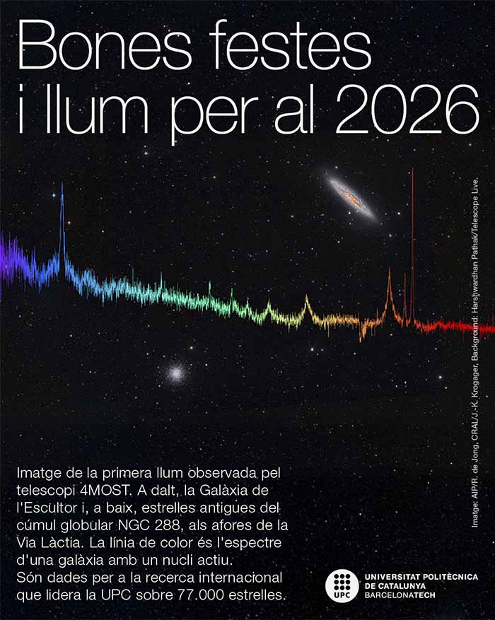 La UPC desitja bones festes i bon any 2026 amb una felicitació que reprodueix la primera llum observada pel telescopi 4MOST, de l’Observatori Europeu Austral. Aquesta instal·lació permetrà a un equip de recerca de la UPC estudiar 77.000 estrelles per desxifrar les incògnites de l'Univers. Així mateix, el rector Francesc Torres ha felicitat les festes amb un vídeo difós mitjançant els canals institucionals.
