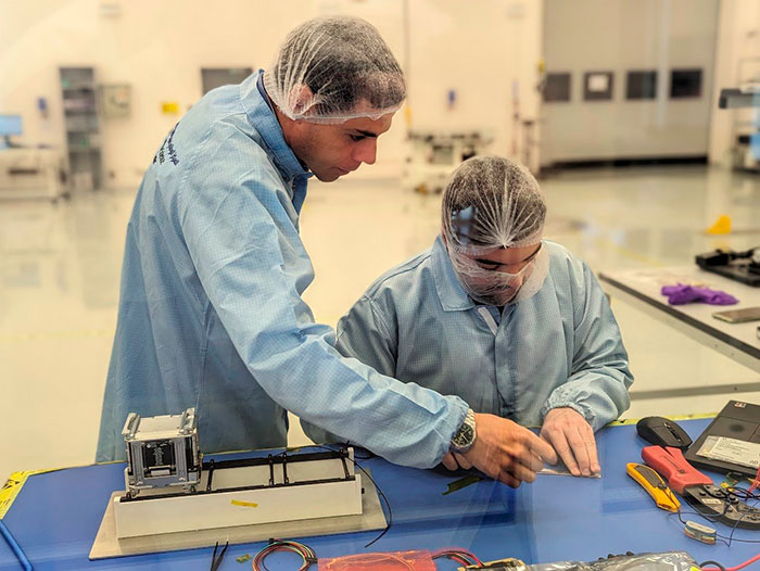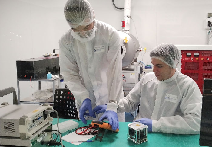 Els doctorands Guillem Gràcia i Solà i Amadeu Gonga i Siles amb la càrrega espacial RITA/3Cat-6, a la sala neta de l'UPC NanoSat Lab