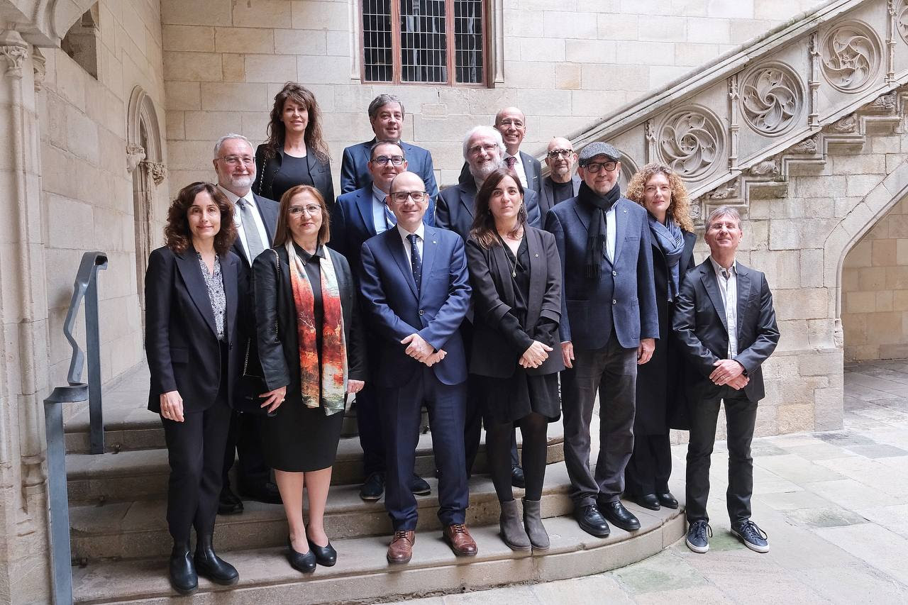 La professora Ana Isabel Pérez, a la dreta, amb la resta d'investigadores i investigadors i membres del sistema català de recerca guardonats amb les medalles i placa Narcís Monturiol, amb el consellera Montserrat al centre.