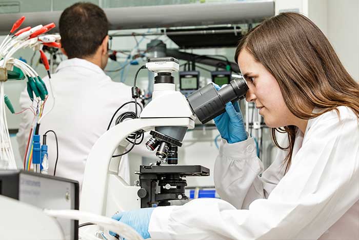 La doctoranda Eva Benzal observa els bacteris objecte d’estudi a través del microscopi òptic