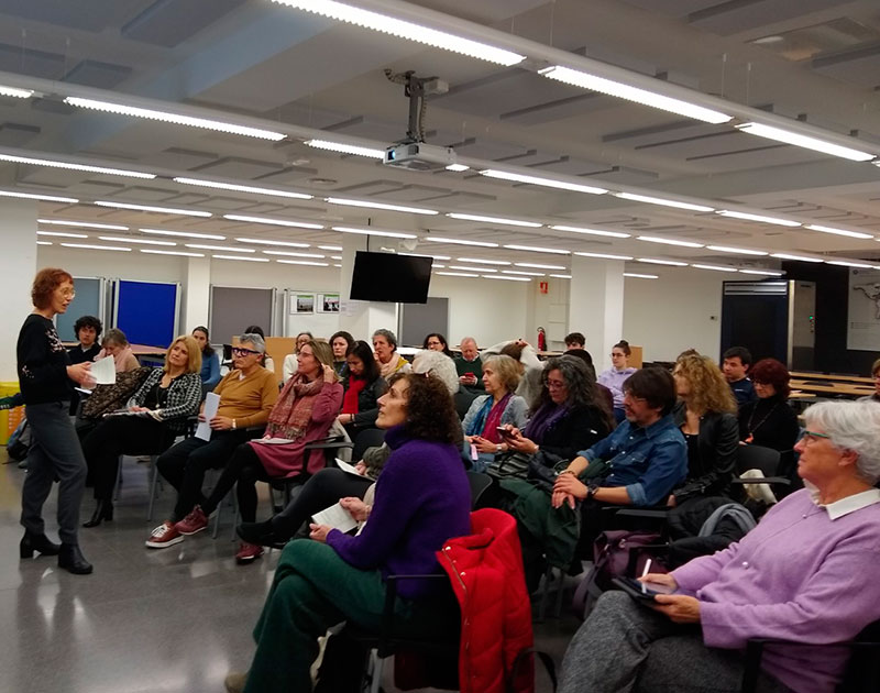 La vicerectora Josefina Antonijuan donant la benvinguda a les persones participants a la fira d'intercanvi d'experiències per al foment de vocacions STEAM