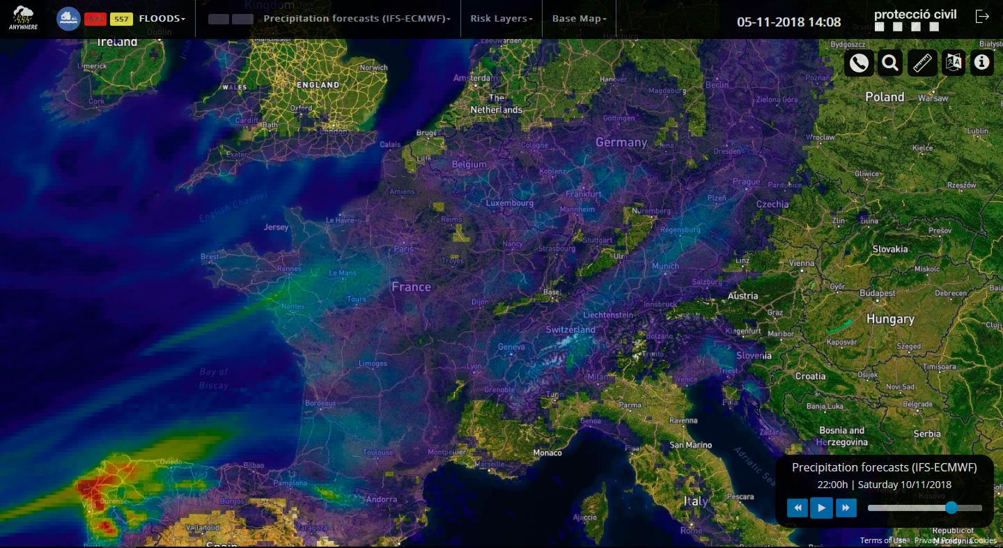 Captura de pantalla de la plataforma A4Cat que mostra les previsions de precipitació a Europa, desenvolupada en en el marc del projecte ANYWHERE per Hyds i implementada en el servei de Protecció Civil de Catalunya (Espanya)