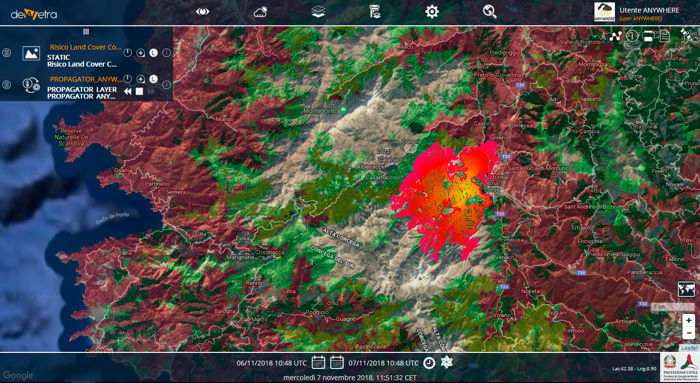Captura de pantalla de la plataforma A4Lig que mostra la propagació d’un foc forestal a Còrsega, desenvolupada en en el marc del projecte ANYWHERE per la Fundació CIMA i implementada al Servei de Protecció Civil de Gènova, a la Regió de Ligúria (Itàlia)
